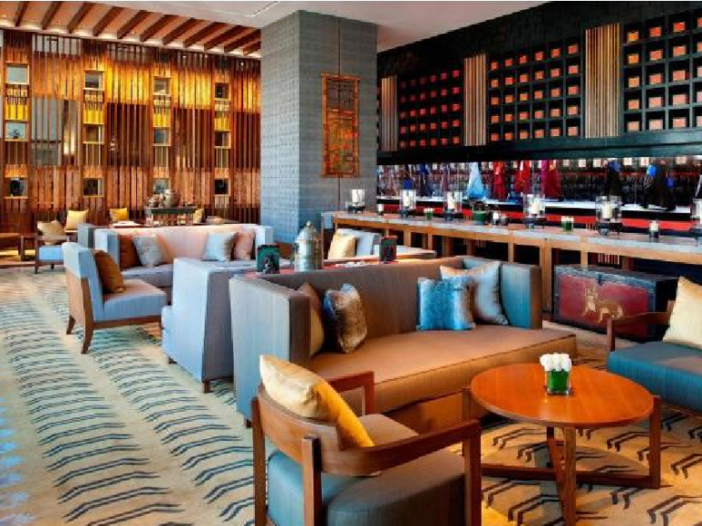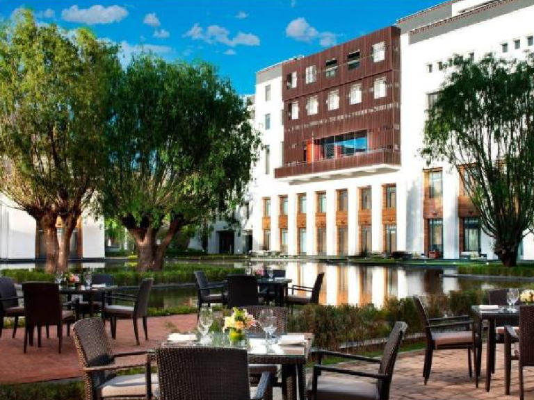 由知名酒店設計師 JEAN MICHEL GATHY 操刀設計,以興建於1419年的沙拉寺為設計靈感,外部有淺灰色的磚牆和黑色塔式屋頂,向古老的藏文化致敬。內部採用了諸多藏族元素,如傳統色彩、材料、帷幔、擺件等,還有12座由當地藝術工作者雕刻的木制佛像。酒店整體宛如一座神秘恢弘的藏式宮殿。