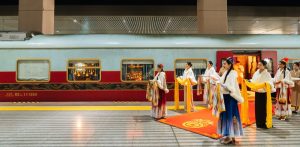 星享宮客廳車 – 創新採用雙開門上車形式,靈感源自漢代馬車的車廂形體與細節。車內空間寬敞,旨在打造一個理想的社交場景。頂級鋼琴品牌博蘭斯勒(Blüthner)的產品與匠心獨具的設計讓古典韻味與現代風格完美融合。藝術孤品與古董銀器穿越歷史長河來到賓客面前,與現代火車工藝相互輝映。
