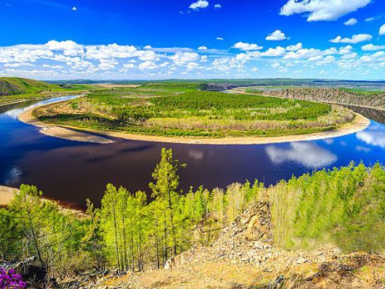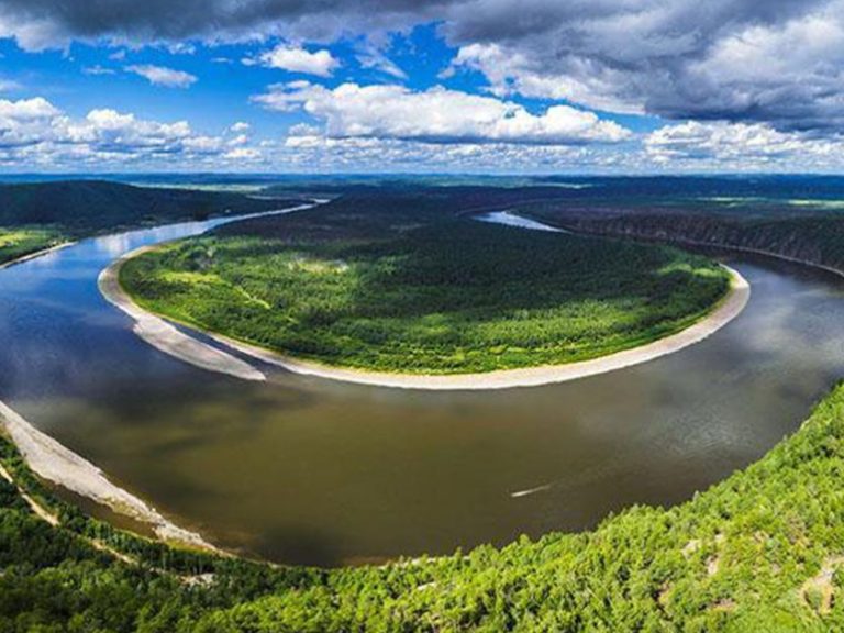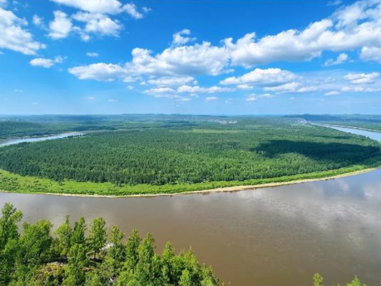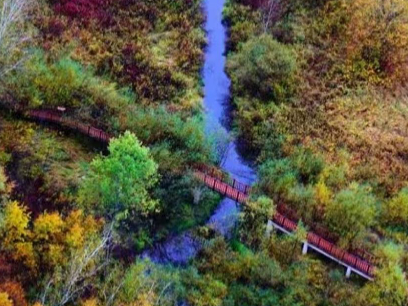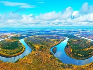 九曲十八彎:黑龍江⽀流額⽊爾河像是一條靈動的巨龍,東西向穿越整個濕地,自然彎曲出眾多沙洲、河灣,「九曲十八彎」因此得名。