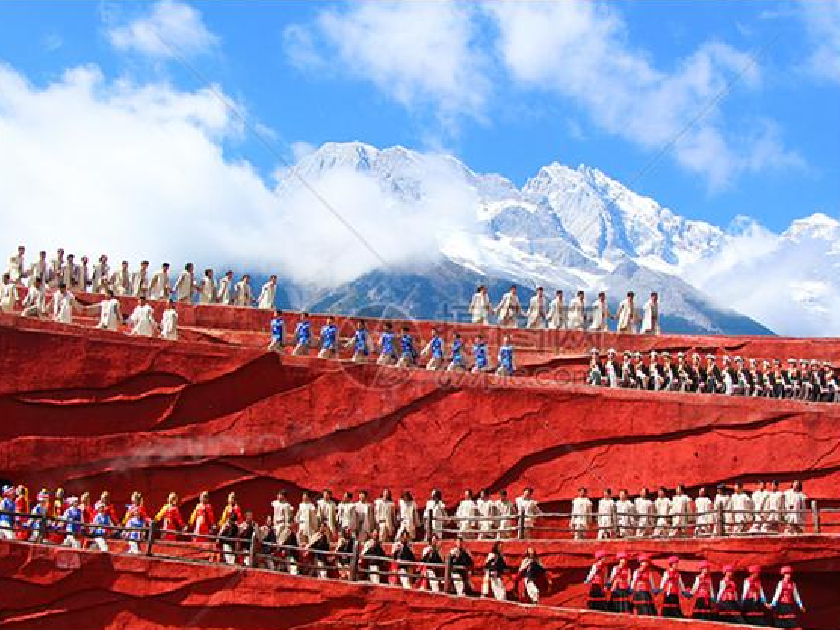 印象麗江巨型歌舞秀:整部作品以雪山為背景,在海拔3100米的世界最高演出場地,用他們原生的動作與質樸的歌聲,帶給您心靈的絕對震撼。