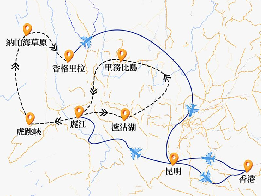 備注:於指定時間前往機場,搭乘客機飛往昆明。
