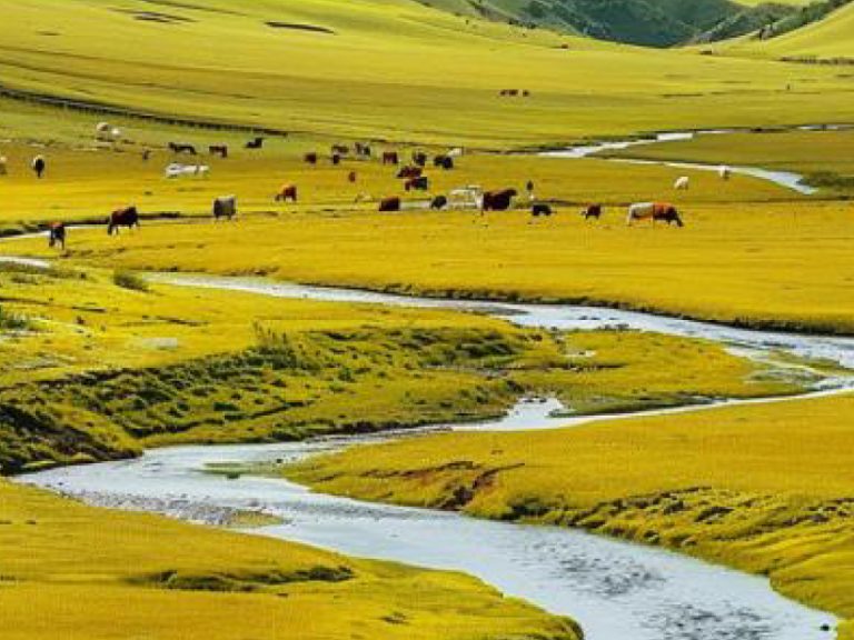 邦傑塘草原:宛如一幅絢麗的畫卷。湛藍天空下,雪山連綿,在陽光照耀下閃耀著聖潔光芒。草原上的草甸由綠轉黃,像金色地毯,微風吹過,草浪起伏。山坡下三色野花綻放,為草原鑲上彩色花邊。尼洋河水清澈蜿蜒,倒映著藍天、雪山與草原。成群的牛羊悠閒吃草,黑色犛牛帳篷上升起緩緩炊煙,構成寧靜祥和的秋日牧歌景象。