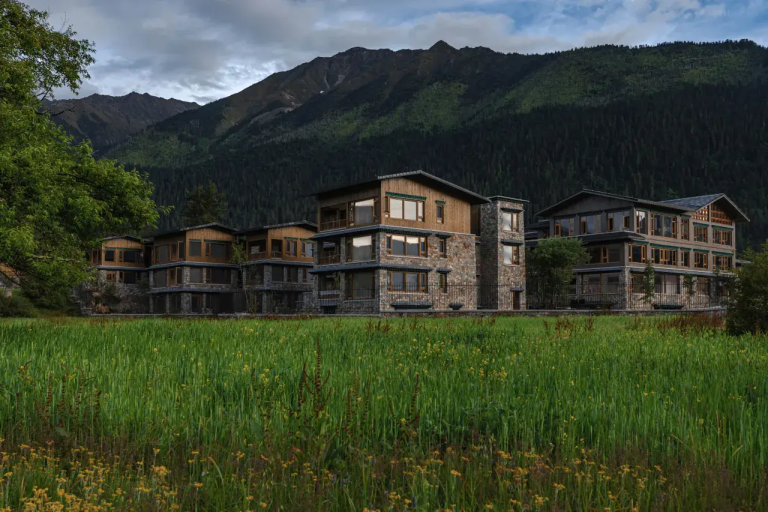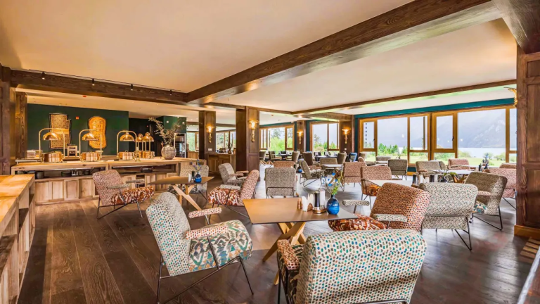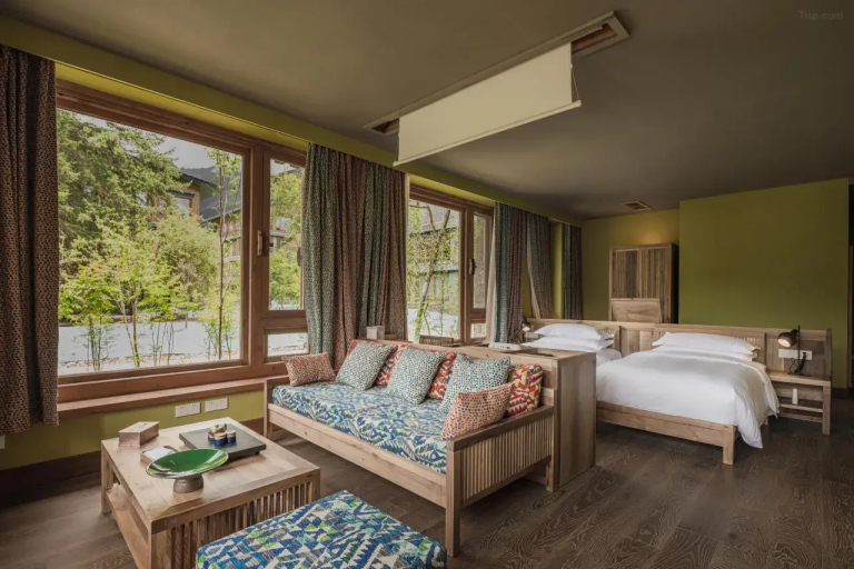 天氣晴好時,酒店北面的傑青那拉嘎布(又名「燃燒的火焰」)在陽光的照射下熠熠閃光。酒店內部的色彩搭配是巴松措自然風光的延伸。從公區到客房,不同區域對綠色元素的使用,對應著湖水的四季變化。