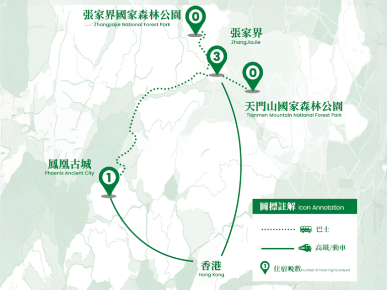 袁家界(包乘環保車):因電影《阿凡達》取景「哈利路亞山」而聞名世界,原型為「南天一柱」,峰體造型奇特,仿如被刀劈斧削般巍巍屹立於張家界,有頂天立地之勢。