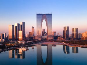 東方之門(賞落日):這是蘇州市地標性的現代建築。其是由兩棟超高層建築組成的雙塔連體建築。塔樓總高度為278米。