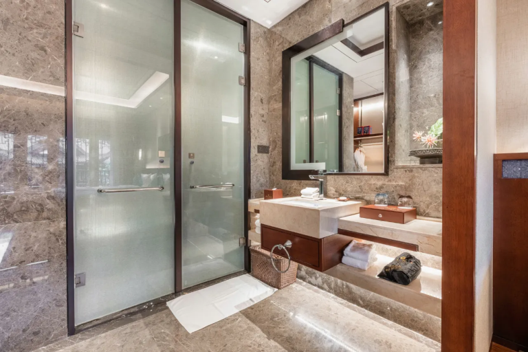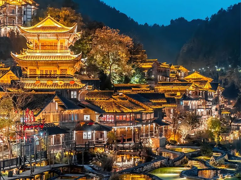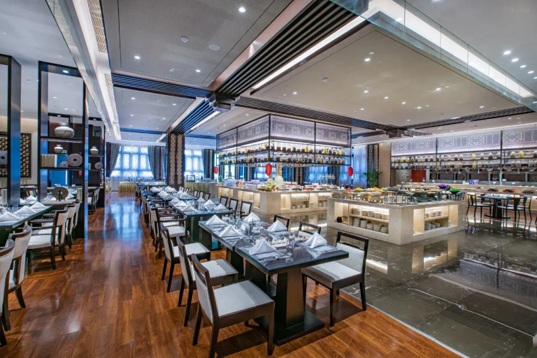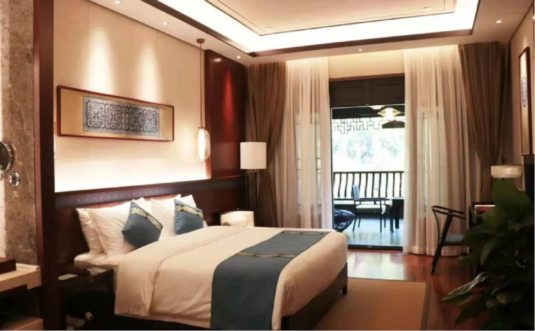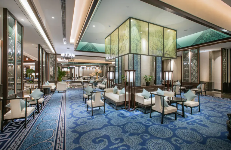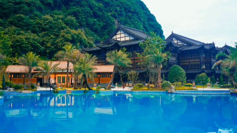 織金飯店位於貴州織金縣平遠古鎮內,坐擁山水絕景,背靠穿洞流雲主峰,俯瞰三潭滾月景區。以「金蝶展翅」為設計靈感,融合中式園林美學與現代奢華。飯店提供恆溫泳池、SPA、特色餐飲(主打宮保菜系及織金烤鴨),並配備管家服務與免費古鎮接駁。其宏偉的4500㎡挑高大堂與真山真水環境,成為貴州超白金五星度假地標,適合追求自然靜謐與文化體驗的旅客。