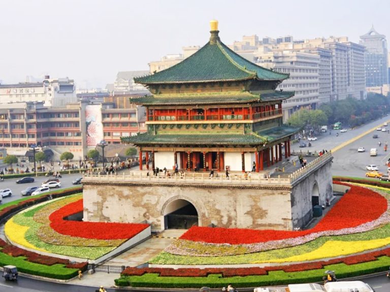 是日由翠明假期領隊陪同下搭乘客機,飛往西安,抵達後遊覽鐘鼓樓廣場。