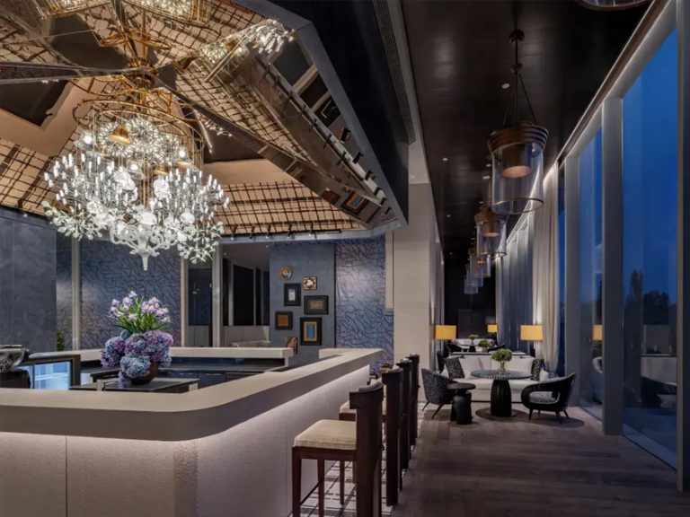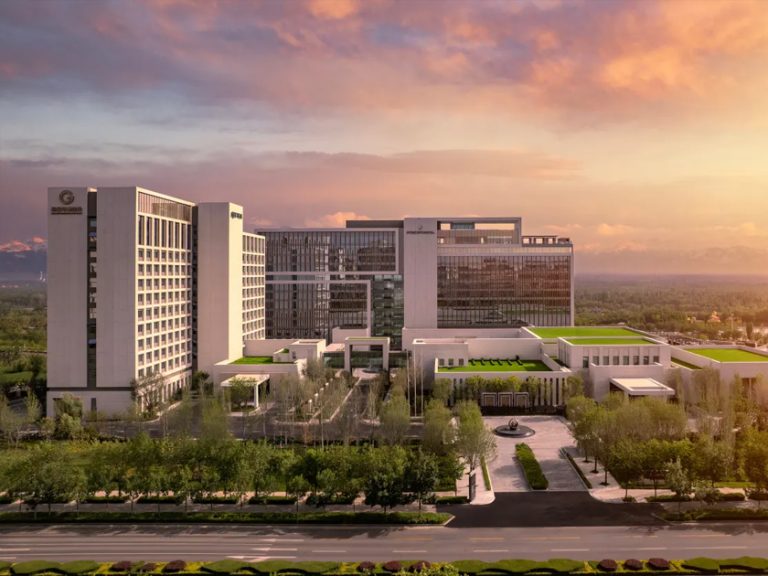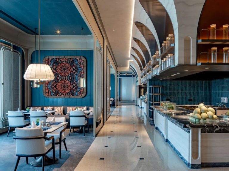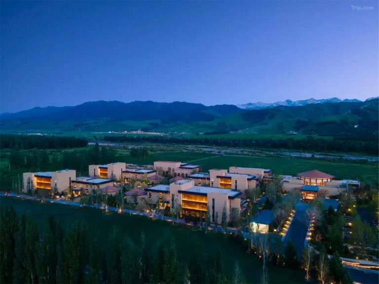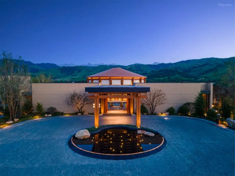 在古烏孫道駝鈴回響處,酒店以當代建築美學演繹千年絲路文明,將天山雪魄與伊犁河谷靈韻凝築成一方詩意棲居地。設計擷取伊犁獨有院落精髓和本地特產果品意象,串聯起多民族藝術長廊,讓葡萄藤影在尖頂拱廊間流轉,伊犁藍的夢幻色彩與手工慢帳相映成趣,令每位賓客在觸摸絲路文脈的同時,感受超越期待的奢華服務。