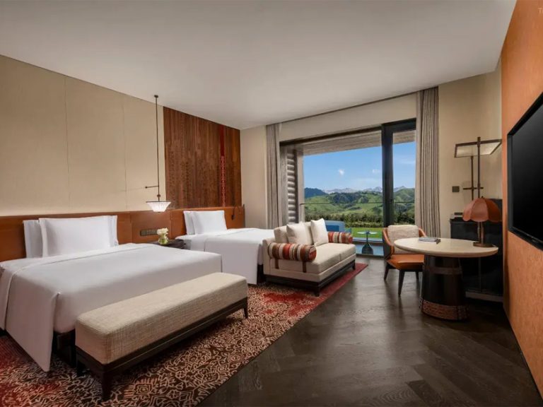 雄踞於烏魯木齊城市天際線的至高點,康萊德酒店以當代設計美學重新詮釋絲綢之路的輝煌傳奇。作為新疆首家超五星級國際奢華酒店,228間客房均以「天山雪線」為設計靈感,全景落地窗將博格達峰與城市燈火盡收眼底。