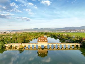 雙龍橋 - 這座始建於明代的古橋,不僅是雲南省規模最大、藝術價值最高的多孔連拱石橋,更以其十七孔橋的宏偉身姿與閣樓相映的絕美風采,享有「滇南第一橋」的盛譽,堪稱中國古橋樑建築中的傑出典範。