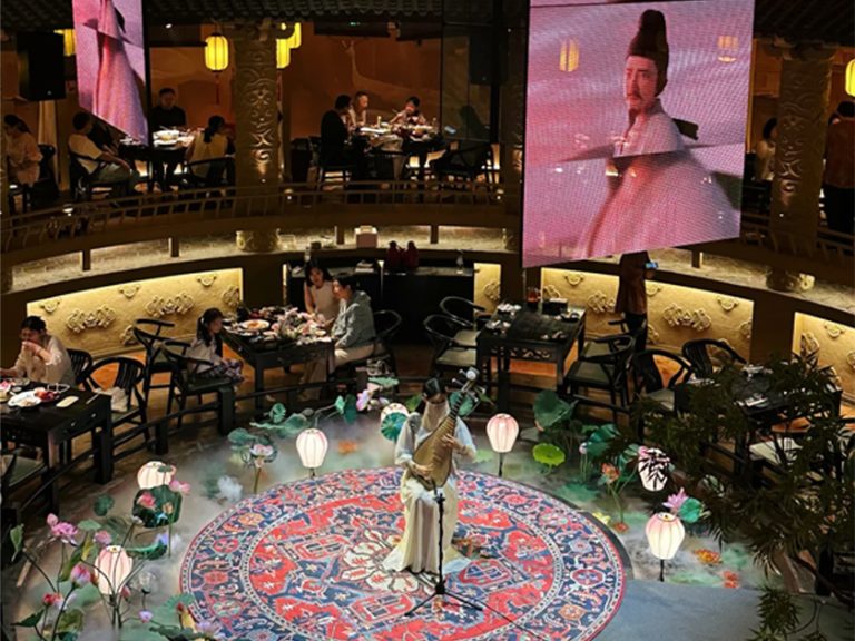 長春新餐飲地標”萃聚唐”,以沉浸式大唐體驗為特色。進門即見唐代元素環繞,建築、燈籠、布幔皆還原唐風。中央設表演區,顧客可圍坐賞唐舞、享美食,每日有演出,並支持換裝拍照。