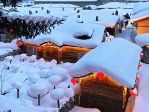 雪鄉晨景:雪鄉的晨霧是冬日清晨最動人的景緻,薄霧如紗般纏繞在層疊的「雪蘑菇」屋舍間,彷彿將人拉入夢幻的冰雪童話世界。