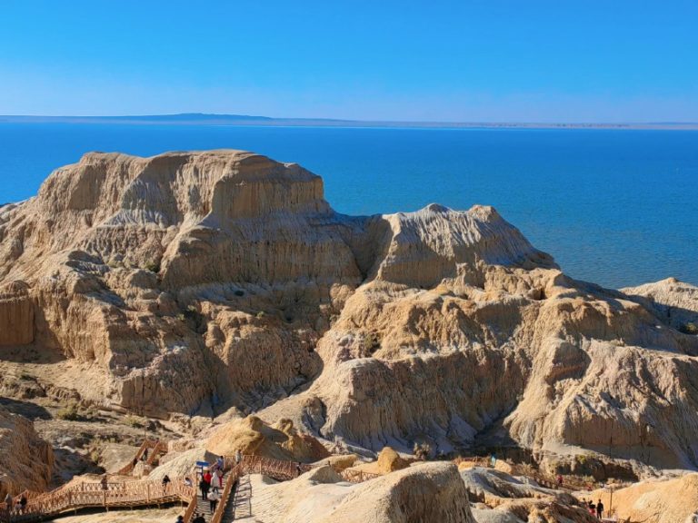福海海上魔鬼城:觀雅丹地貌與湖水交織,全國罕見的濱水雅丹奇觀,風蝕土丘如城堡聳立湖畔,遠眺烏倫古湖碧波蕩漾,壯美而神秘。