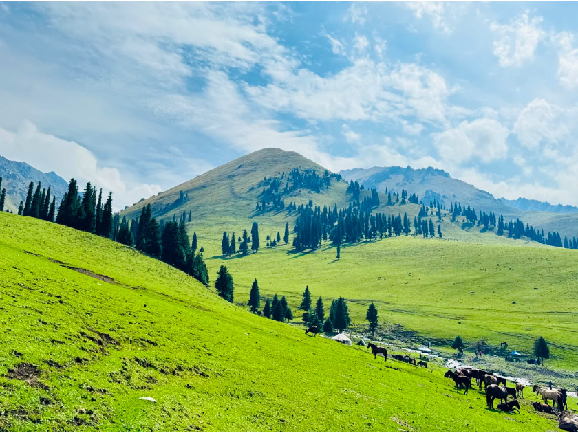 那拉提空中草原(含區間車和天界臺纜車):位於天山腹地,平均海拔約2200米,四周雪山環繞,草甸起伏如毯,雲影掠過牛羊悠然,被譽為「人間最後的空中花園」。