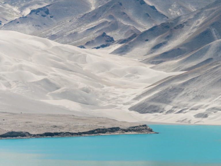 布倫口白沙湖:銀白沙山與湛藍湖水相映成趣,被譽為「冰山下的聖湖」,湖光山色純淨如畫。