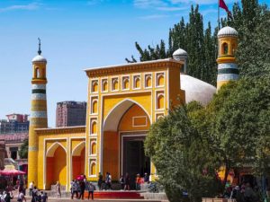 艾提尕爾清真寺(外觀):中國伊斯蘭教著名清真寺,是維吾爾族古建築藝術的典範,以其宏偉的規模與濃厚的宗教氛圍聞名。