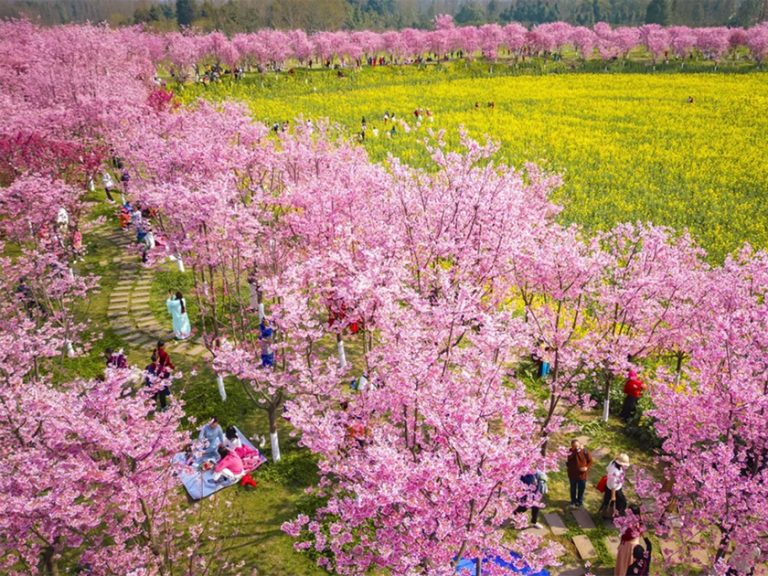 覆蓋嘉陽油菜花 – 乘蒸汽小火車穿行,金川梨花綿延百公里「中國雪梨之鄉」;都江堰問花村梅花+海棠,3月中下旬梨花盛花期更添純白浪漫,春日氛圍感拉滿!