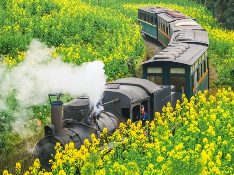 嘉陽油菜花田:乘世界唯一正常運行窄軌蒸汽小火車,穿行萬畝油菜花田。