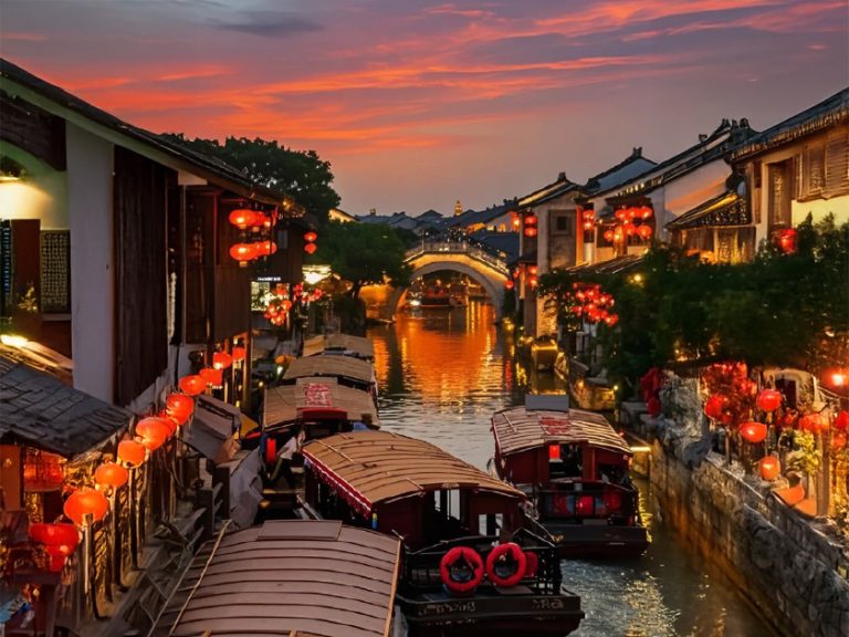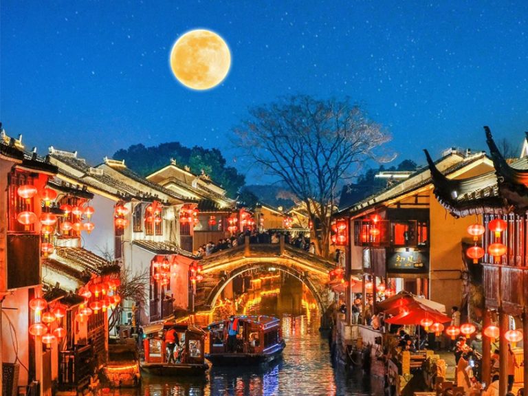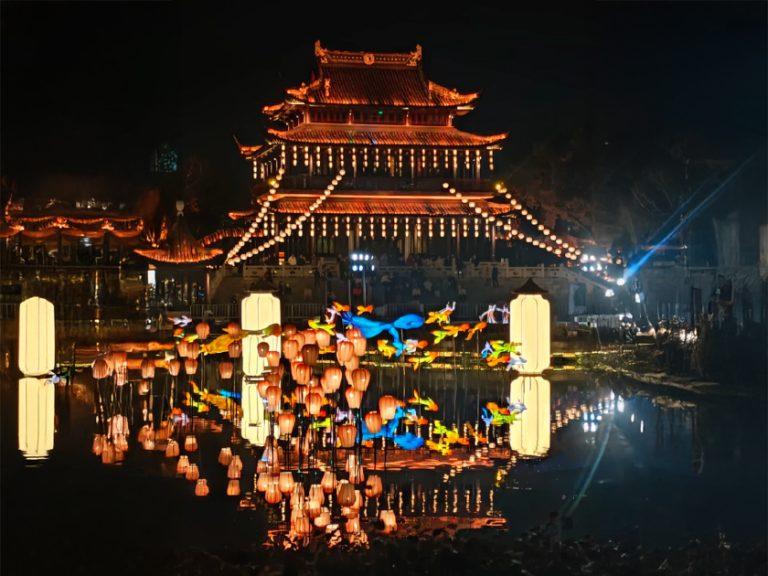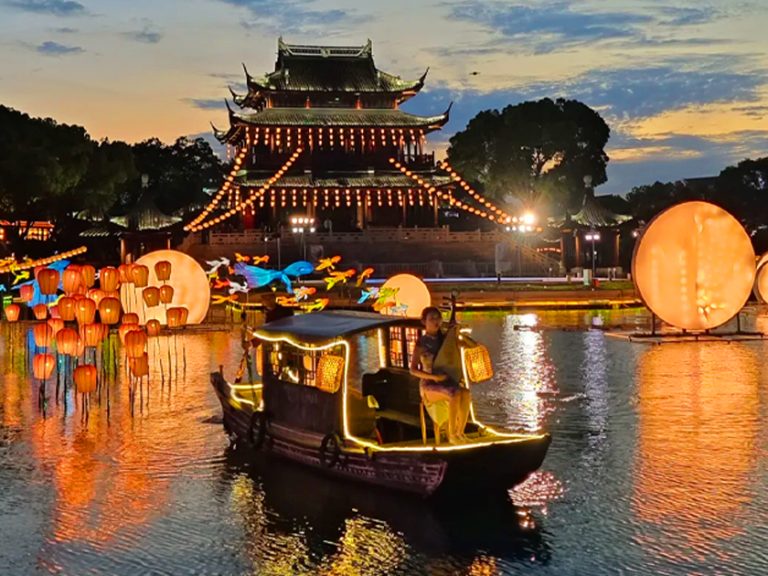 無錫拈花灣禪意小鎮:白天穿越唐風建築,賞花簪、寫福字;入夜漫遊燈海星河,看一場「禪行」光影大秀與千年打鐵花表演,在絢麗燈影裡,許下新年歲月靜好願望。