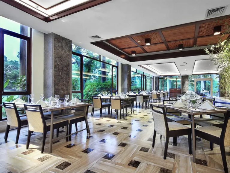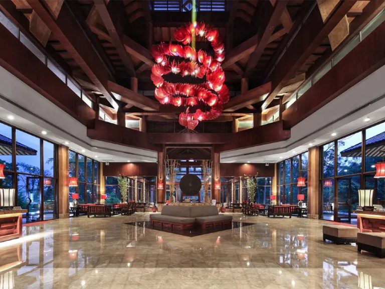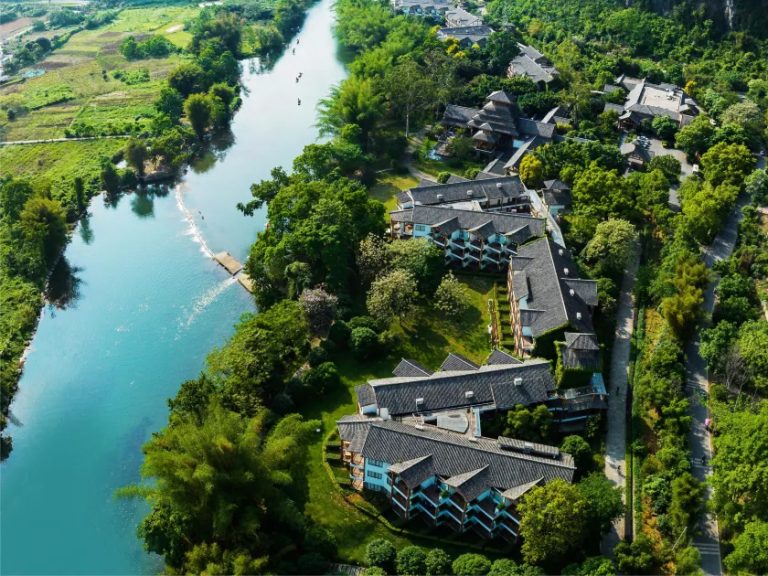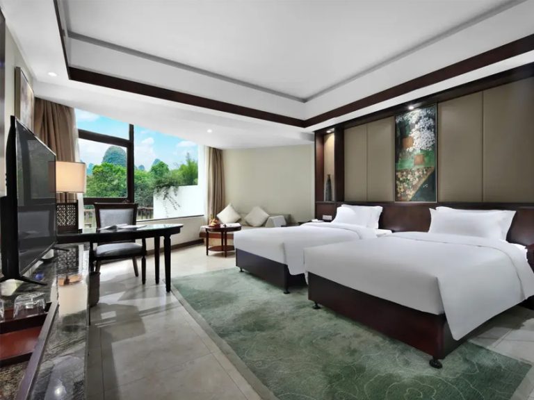 酒店地處灕江江畔,以中式古典為設計主題,在寬敞的客房裡即可欣賞景色旖旎的灕江,飽覽綠意盎然的園林。