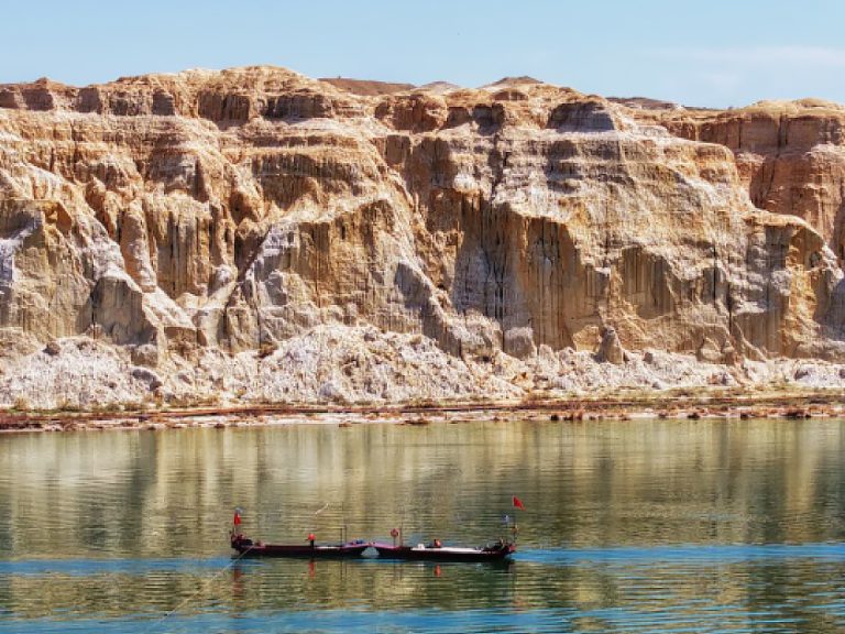 福海海上魔鬼城:觀雅丹地貌與湖水交織。
