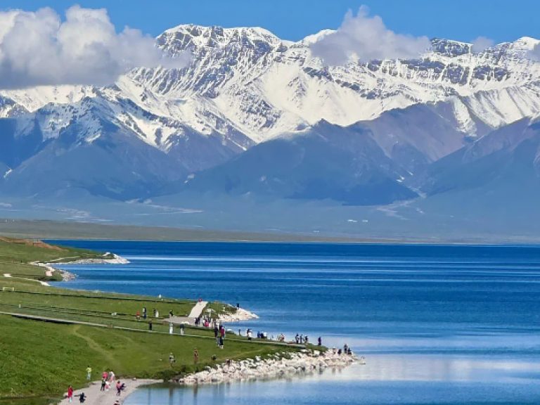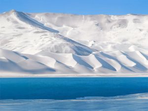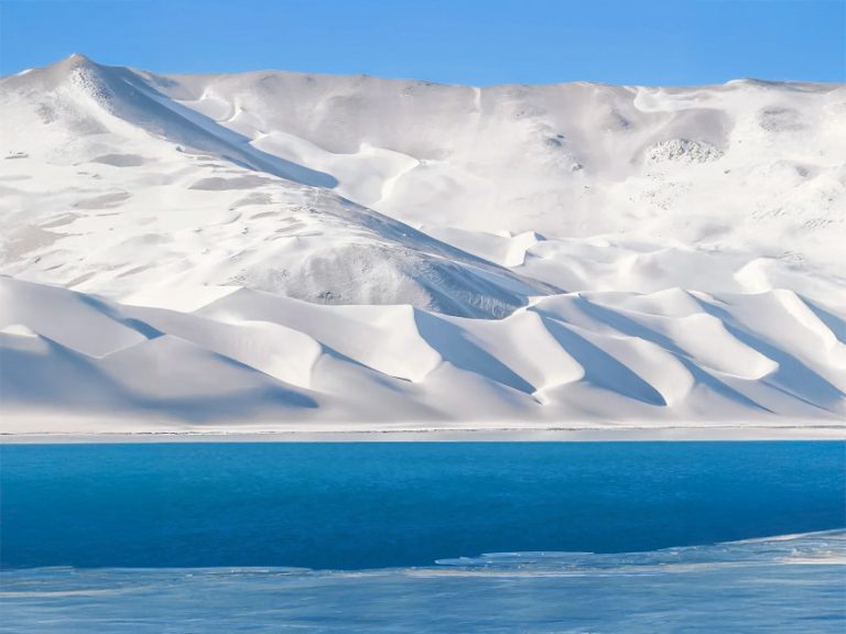 布倫口白沙湖:銀白沙山與湛藍湖水相映,被譽為「冰山下的聖湖」。