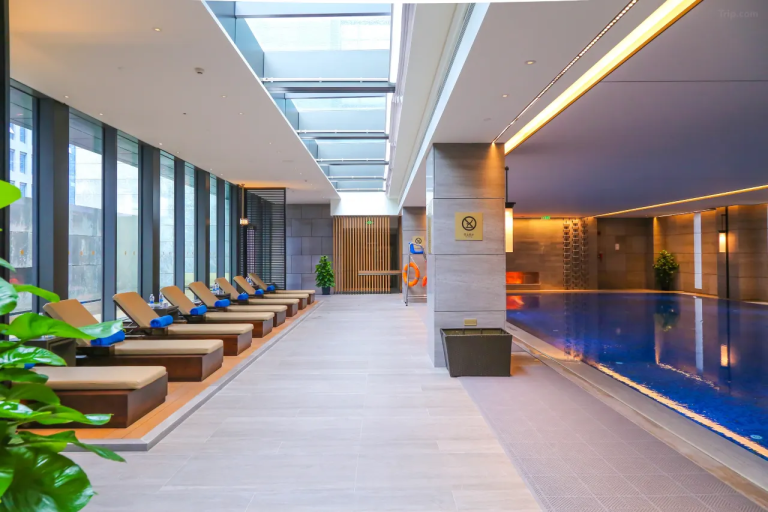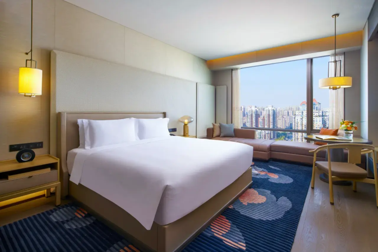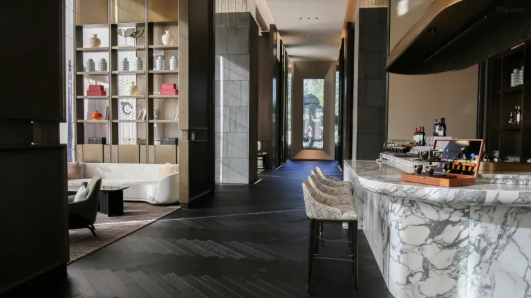 以「東方園林,唐風意蘊」為靈感,融匯中西現代美學,採用中式園林「坐北朝南」和中軸對稱佈局,打造出隱於鬧市中的園林私邸謐境。客房整體設計優雅現代,全景落地窗帶來開闊視野,皮革材質的牆面由匠人全手工編織,體現中華傳統技藝,細節觸感盡顯奢華。