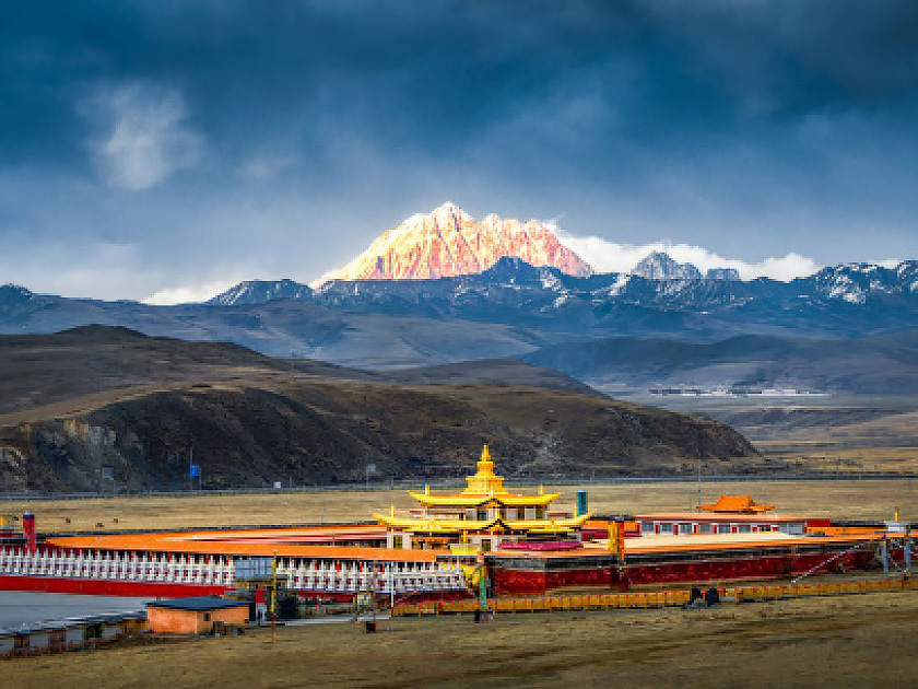 【飛來寺】始建於明萬曆四十二年,依正乙山山勢拾級而建,寺內建築高低錯落,殿堂屋宇相互呼應,融合佛、道、儒三教文化,是藏區著名的佛教聖地,亦為遠眺梅里雪山「日照金山」的絕佳觀景點。