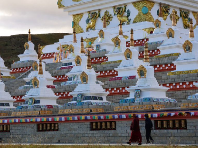 【尊勝白塔林】稻城白塔,又稱尊勝塔林,是進入稻城的門戶,亦為康南地區唯一的塔林公園。此塔林規模宏大、布局莊嚴,融合藏傳佛教文化與自然景觀,在全世界絕無僅有,被視為祈福淨心的聖潔之地。