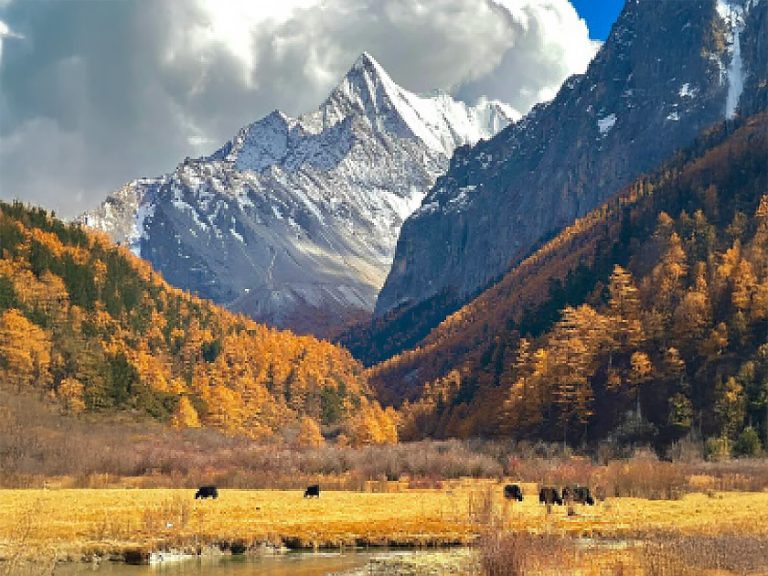【新都橋】位於318國道川藏南北線分岔路口,號稱「攝影家的天堂」。此處光影流轉,四季皆景:無垠草甸、蜿蜒溪流、層林盡染的金黃秋葉與遠山雪峰交織成畫,令人心醉神迷。