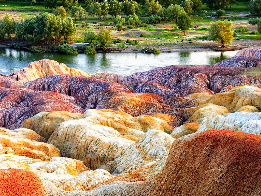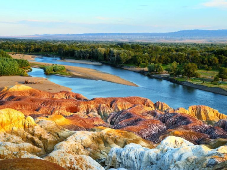【五彩灘】雅丹地貌在春日陽光下層次分明,絢爛如畫,與奔流不息的額爾齊斯河相映成趣,形成剛柔並濟的獨特風景。