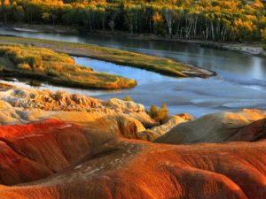 【五彩灘】雅丹地貌在春日陽光下層次分明,絢爛如畫,與奔流不息的額爾齊斯河相映成趣,形成剛柔並濟的獨特風景。