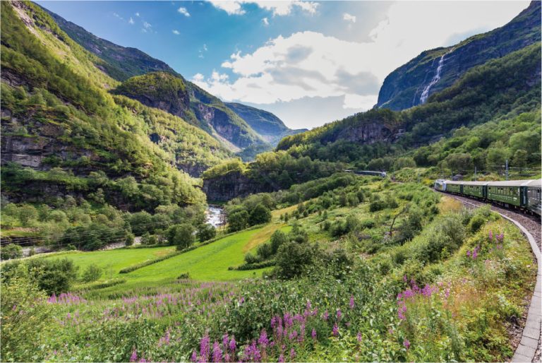 【弗洛姆高山火車】挪威縮影火車,縱橫峽灣高山。這條鐵路被譽為全球最美鐵路之一,同時也是全球最陡峭的鐵路之一,平均坡度達 5.56%。從谷地海平面爬升到冰雪覆蓋的群山中,約海拔 887 公尺的米達爾(Myrdal)車站,沿途經過瀑布、河流、峽灣谷地、隧道等下午自由休閒地漫步弗拉姆小鎮。