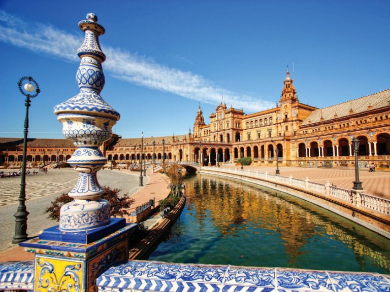 【西班牙廣場】位於馬利亞路易莎公園內,廣場內弧形拱牆上以鑲嵌彩繪瓷磚呈現歷史故事的瓷畫,並以精雕細琢的磁片貼飾各省徽章和歷史故事而聞名。