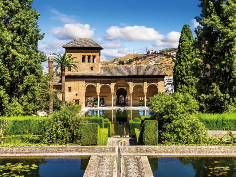 【阿爾罕布拉宮】融合了伊斯蘭建築的精緻與阿拉伯式庭院的韻味,以桃金娘中庭、獅庭等四大中庭為核心,內部牆壁與天花板的鑲嵌雕刻極盡奢華,十二獅子托起噴泉的設計更是經典。