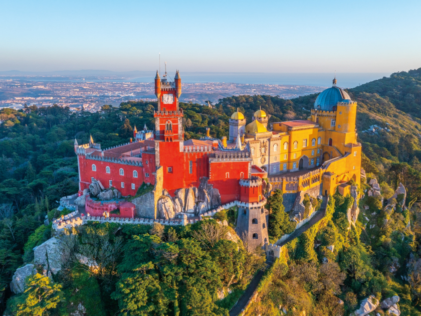 【佩納宮】屬浪漫主義風格宮殿,融合哥德式、摩爾式、文藝復興式及曼努埃爾式等多元建築元素,外觀以紅、黃兩色為主,塔樓、圓頂等設計宛如童話城堡。