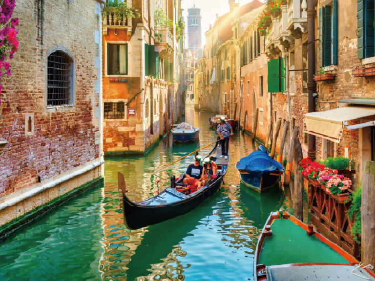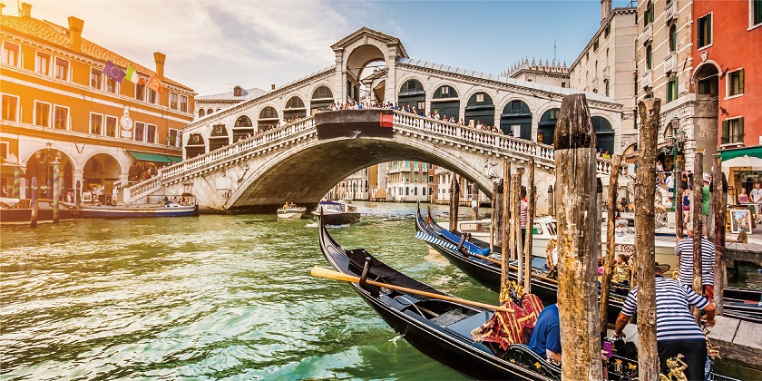 【威尼斯】素有意大利「水鄉」之稱,「水城」上的嘆息橋、道奇皇宮、聖馬可教堂及鐘樓等,皆是不容錯過的拍攝景點。另可參觀由專人示範製作慕拉諾玻璃的過程,還可自費乘坐特色貢多拉平底船暢遊大小運河,親身體驗水鄉風情。