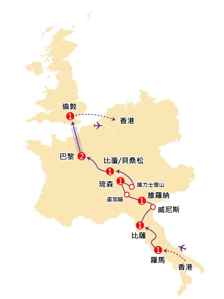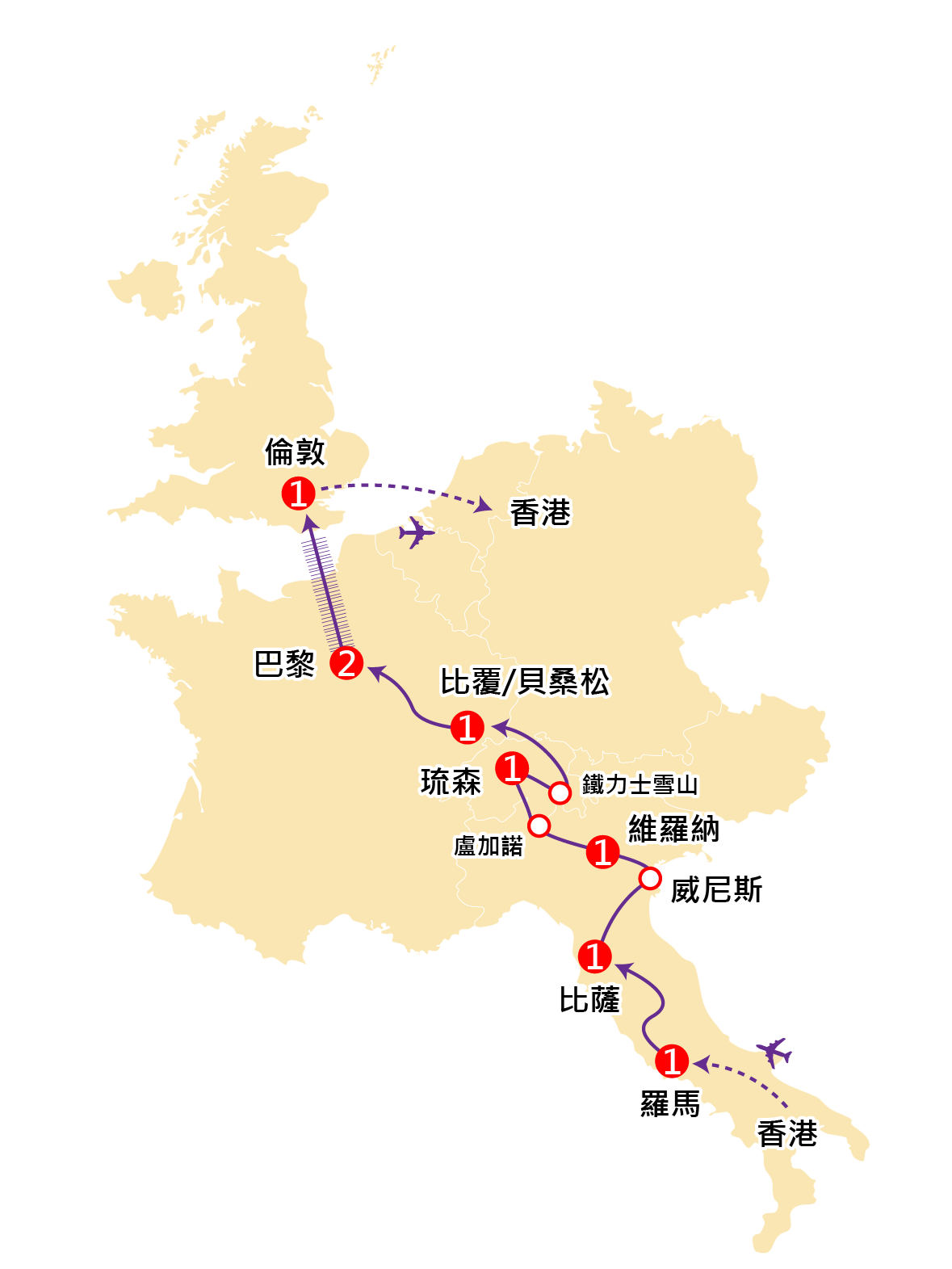 稍後於指定時間驅車前往機場,乘坐歐洲或中東航空公司客機,經歐洲或中東城市轉機飛返香港。航機於第11天抵達香港國際機場。