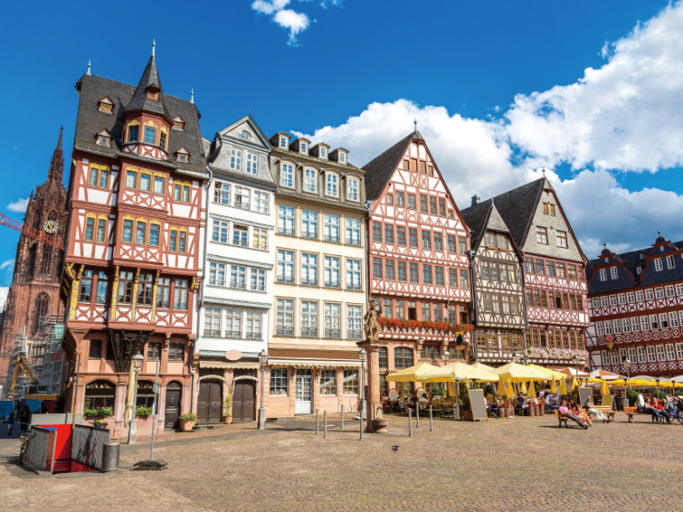【羅馬廣場】是整個法蘭克福的中心,周圍的建築充滿浪漫的中世紀氛圍,舊市政廳、老聖尼古拉教堂都在這座廣場上。