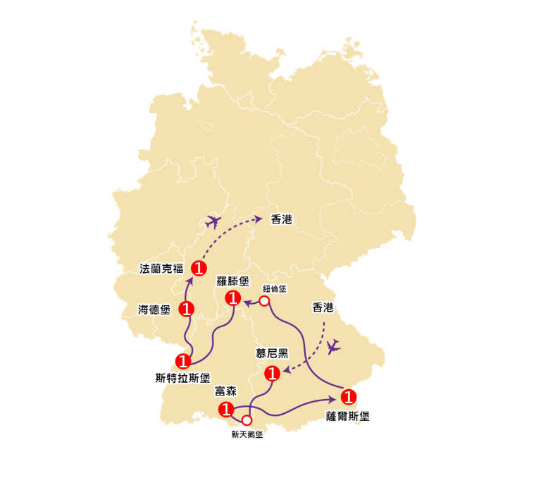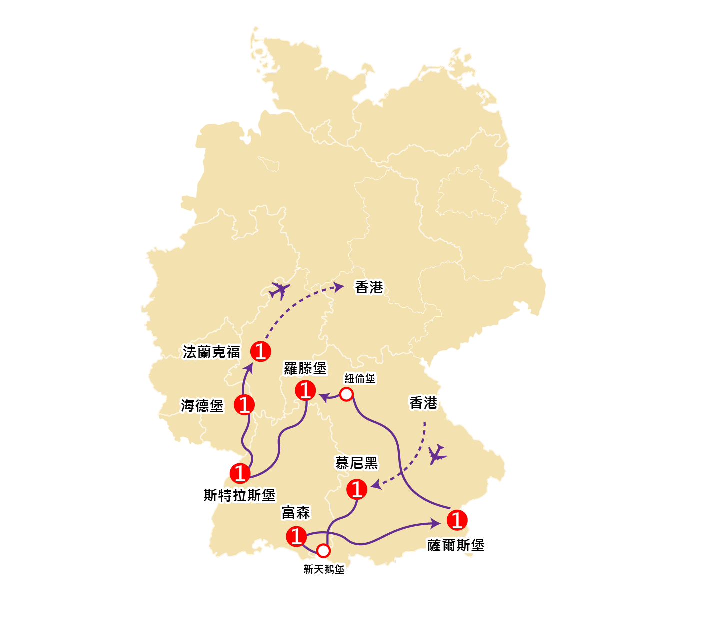 注意:如乘坐阿聯酋航空公司,將於出發日期第一天晚上集合及於第二天凌晨航班起飛經杜拜轉機後飛往德國慕尼黑。