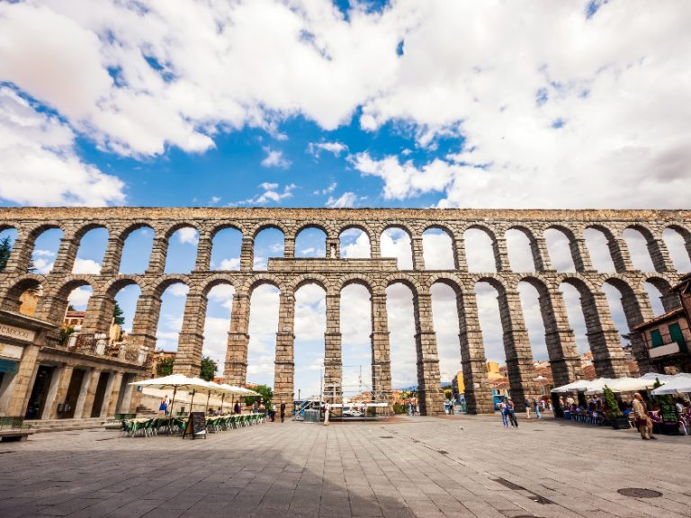 【塞哥維亞古城】位於馬德里北方約 90 公里處,瓜達拉馬山的避暑勝地,城內仍保留著公元 1 世紀,長 728 尺完整的羅馬水道遺跡,是塞哥維亞的地標性建築。烤乳豬是塞哥維亞的特色美食,甚至在紀念品商店,都有可愛版的乳豬吊飾等等。