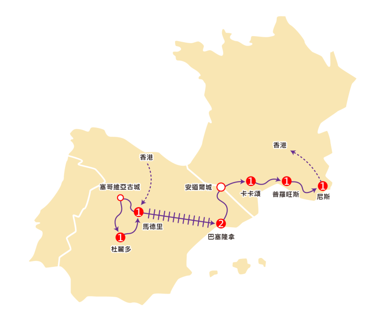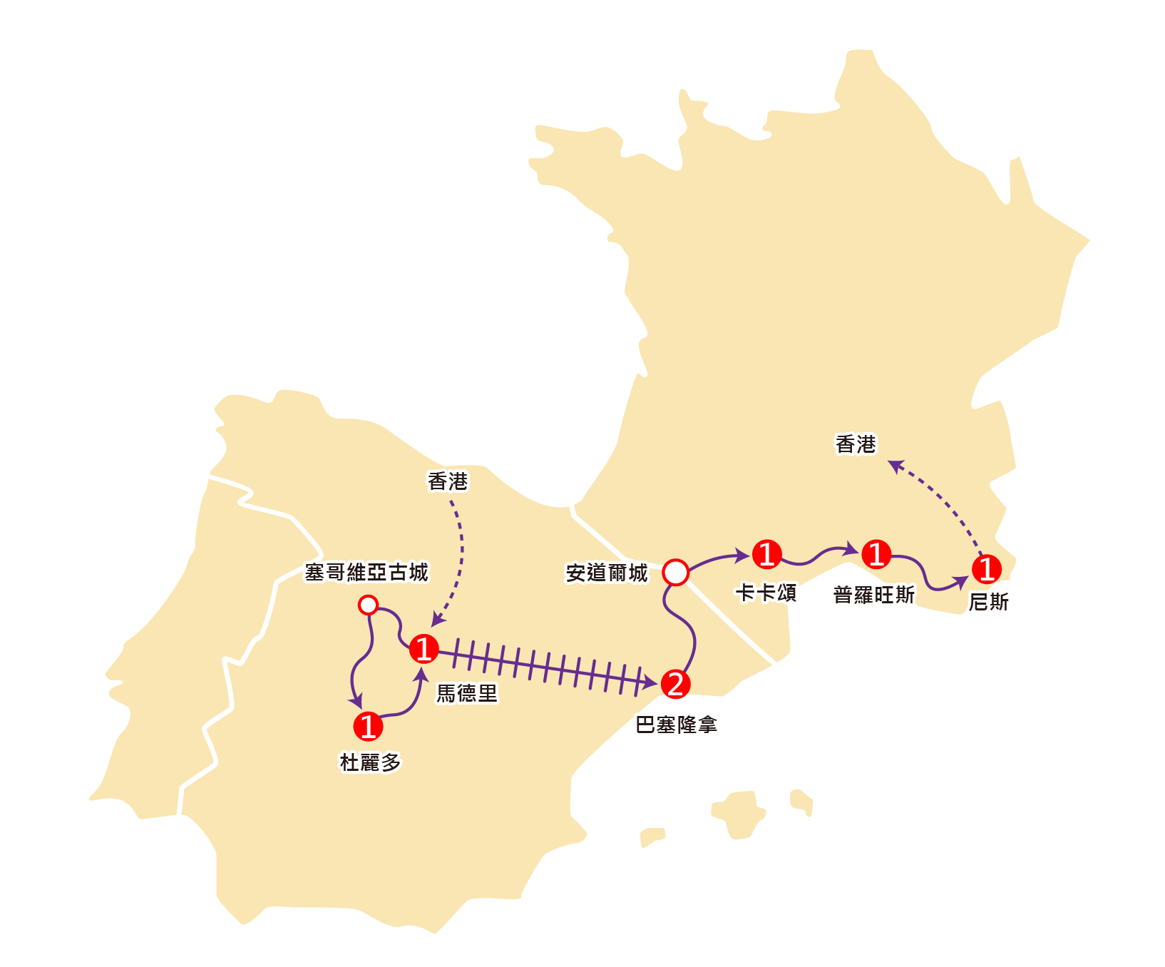 早:酒店 |午:當地餐廳品嚐加泰隆尼亞湯、西班牙火腿及地道魚 |晚:中式餐廳(8 餸 1 湯)