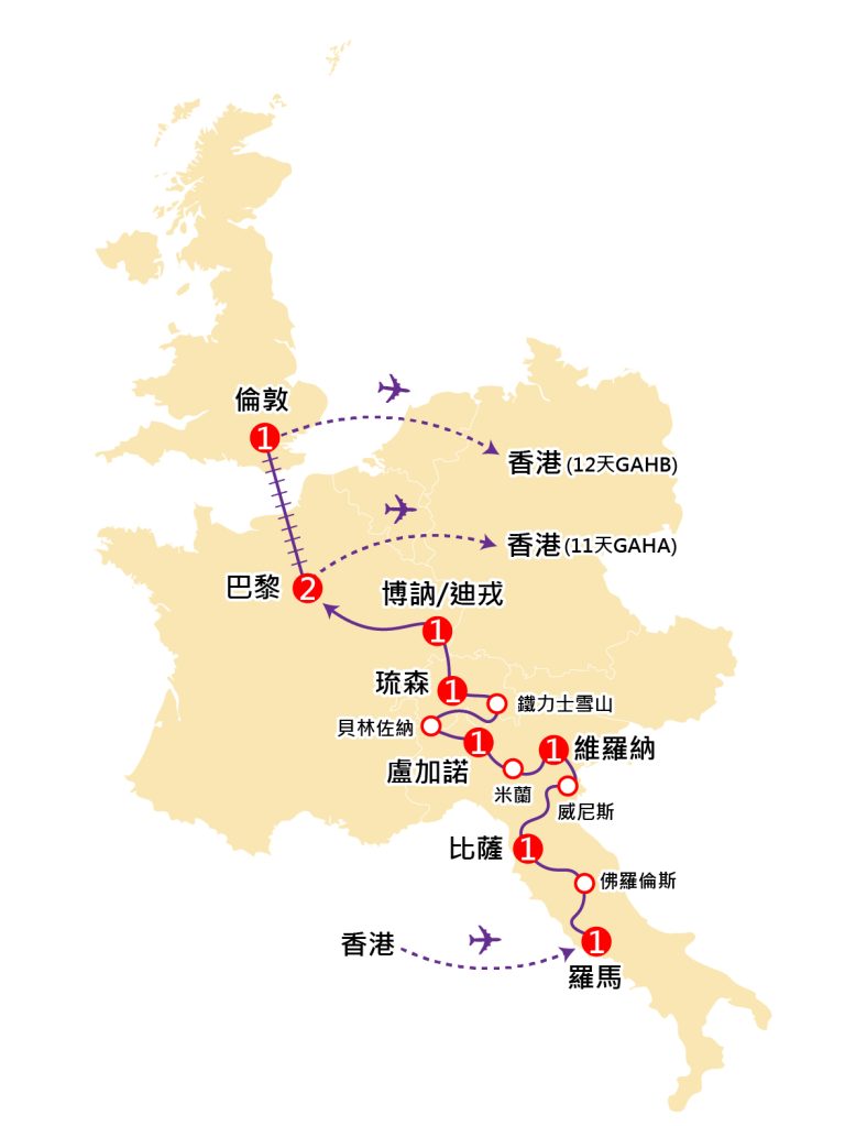 注意:如乘坐阿聯酋航空公司,將於出發日期第一天晚上集合及於第二天凌晨航班起飛經杜拜轉機後飛往羅馬。