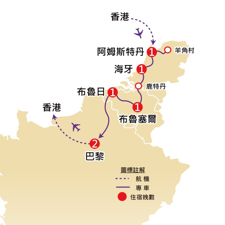 注意:如乘坐阿聯酋航空公司,將於第一天晚上集合,並於第二天凌晨起飛經杜拜轉機後飛往荷蘭首都~阿姆斯特丹。而行程內容保持不變,敬請留意。