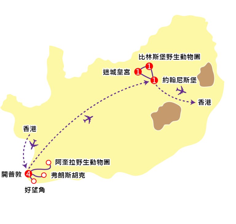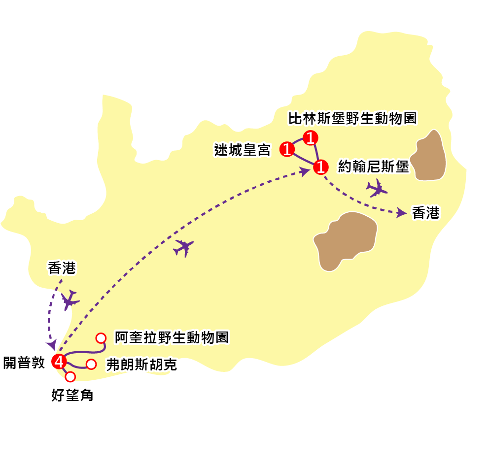 早餐後專車前往機場乘坐內陸航機飛往約翰尼斯堡,抵達後前往午餐,餐後前往太陽城迷城皇宮。