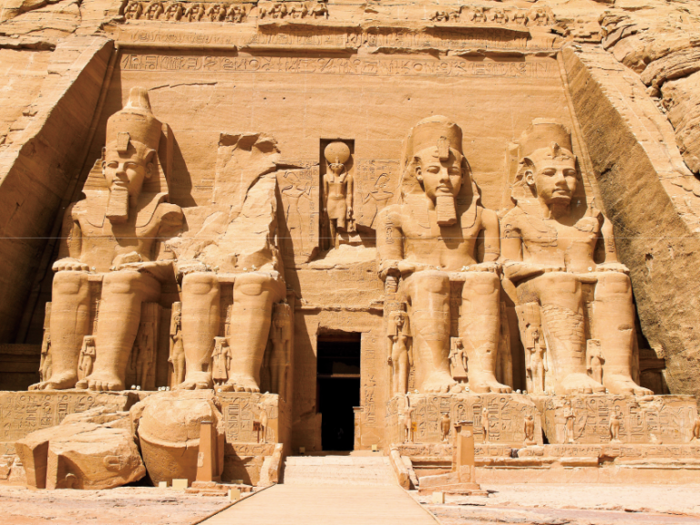 【阿布辛貝神殿】拉美西斯二世在位時所建造最偉大的建築,神殿深達60餘公尺。為了避免遭亞斯文大壩建成後被河水淹沒,聯合國與埃及政府合力,花費4年的時間,將大神殿切割成大石塊,搬運到現在的位置,實為拯救古代遺跡的大工程。