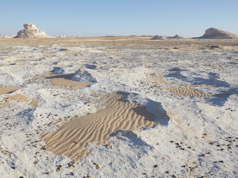 大自然神奇的力量讓沙子呈現雪白色,與周圍的黃色沙漠形成鮮明對比。白色岩石風化而成各種奇特形狀,四處林立著蘑菇石、駱駝岩、雞冠石等地質景觀,蔚為奇觀。