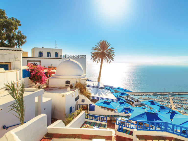 【西迪布賽伊德】海濱小鎮面向地中海,「白屋藍窗」之建築隨處可見,狹窄的街道彷如置身於希臘小島,團友可隨意拍攝美景,搜羅特色紀念品。