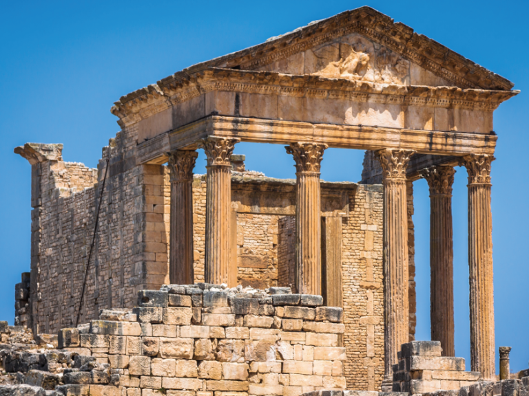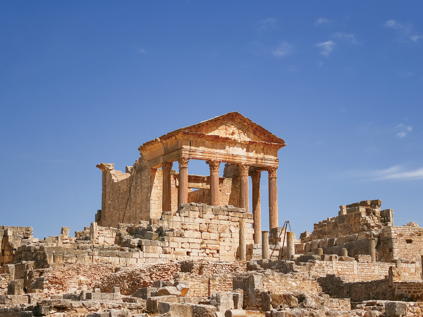 建於公元前6世紀末,位於海拔600公尺小山丘上的杜加古城,古城居高臨下具有極佳的戰略位置。杜加古稱「Thugga」是石頭山的意思。