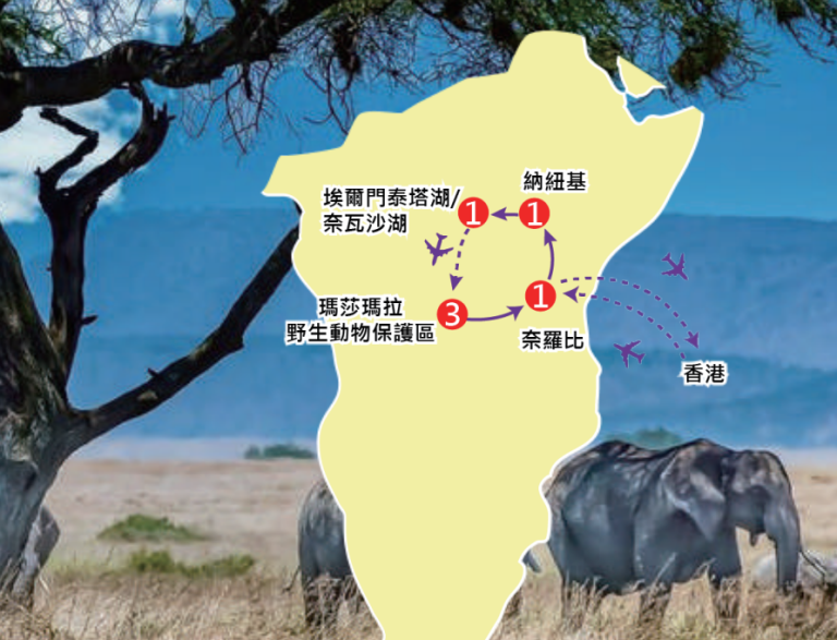 是日晚上,於香港國際機場集合,由翠明假期領隊陪同下,乘坐阿聯酋航空公司客機經杜拜轉機、或乘坐卡塔爾航空公司客機經多哈轉機、或乘坐埃塞俄比亞航空公司客機經阿的斯阿貝巴轉機後飛往肯尼亞首都~奈羅比。